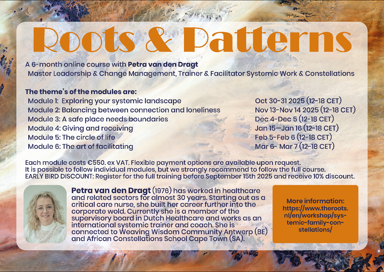 Systemic Work is often referred to as Family Constellations. This method is based on the insight that we are all deeply influenced by the systems we belong to: our families, workplaces, communities, and more. These systems shape our behavior, relationships, and patterns. This happens often unconsciously.
